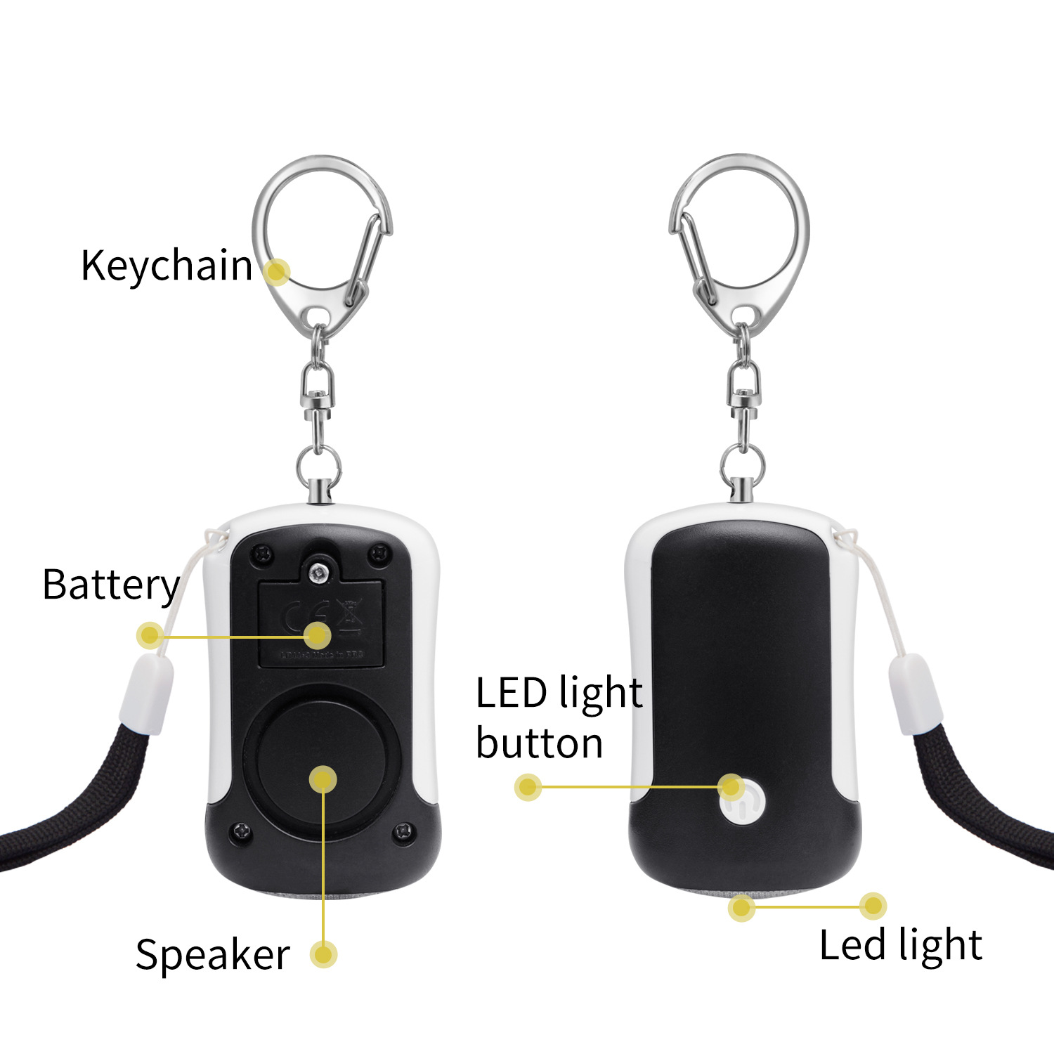1.声音报警功能:需要求救的时候拔出钥匙链即发出125DB以上报警声。