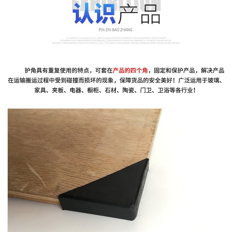 塑料护角是一种新型的包装防护材料,具有韧性好,耐冲击性强,可重复使用的特点,用于物品终端保护及货物包装、包扎时边缘保护,有效防止产品装卸或运输过程中受碰撞而损坏。采用护角后,货物包装平整美观,不破损,装卸、运输更放心,目前广泛应用于家具、石材、玻璃、建材、木业、机电、门业、电子电器、灯饰、陶瓷、纸业等行业,是出口企业和包装企业提高自身产品形象的好帮手。