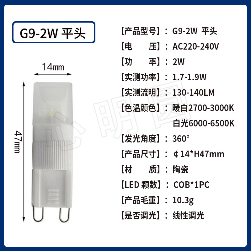 원산지 중국 가져오기 여부 아니오 주문 번호. G9-Y 도자기 브랜드 HLG 항목 번호. 2W 3W 모델 G9-올 세라믹 입력 전압 220 LED 칩 브랜드 사난광전자 LED 램프 비드 모델 COB 고출력 램프 비드 LED 램프 비드의 수 1 색 온도 2800-3000k/6000-6500k 광속 180-300 빔 각도 360 색상 렌더링 색인 75 램프 본체 소재 PC + 세라믹 램프 홀더 사양 G9 디밍 가능 예 전체 치수 (Φg * H) 사이즈 차트를 봐 무게 11 인증 Ce 전원 짧은 1W 밝은 색상 220V 화이트 6000-6500K 일반 납세자 여부 예 특허가 있는지 여부 아니오 -