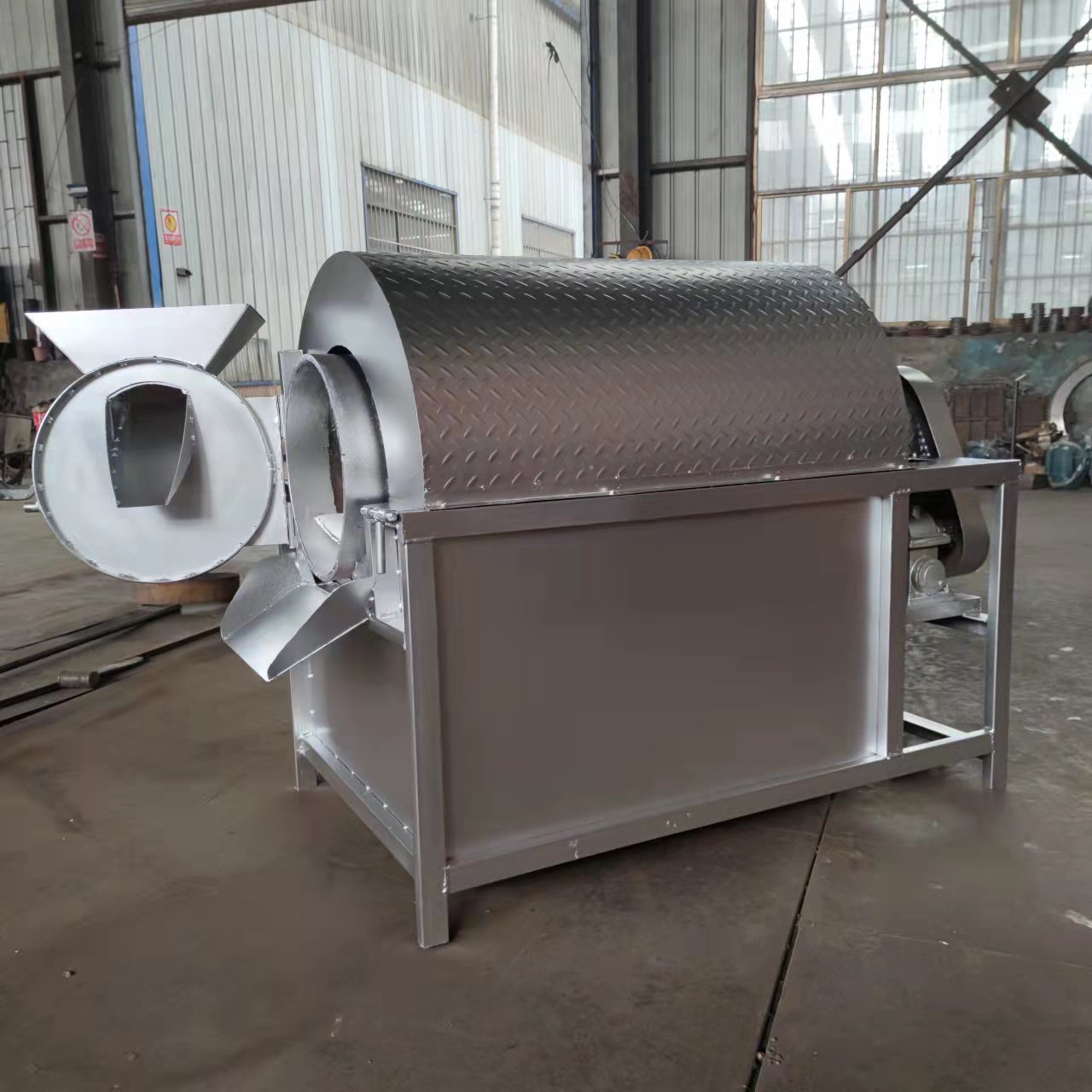 2.炒货机采用的滚筒卧式结构,加热均匀,密封性好,烘炒效果特别好。