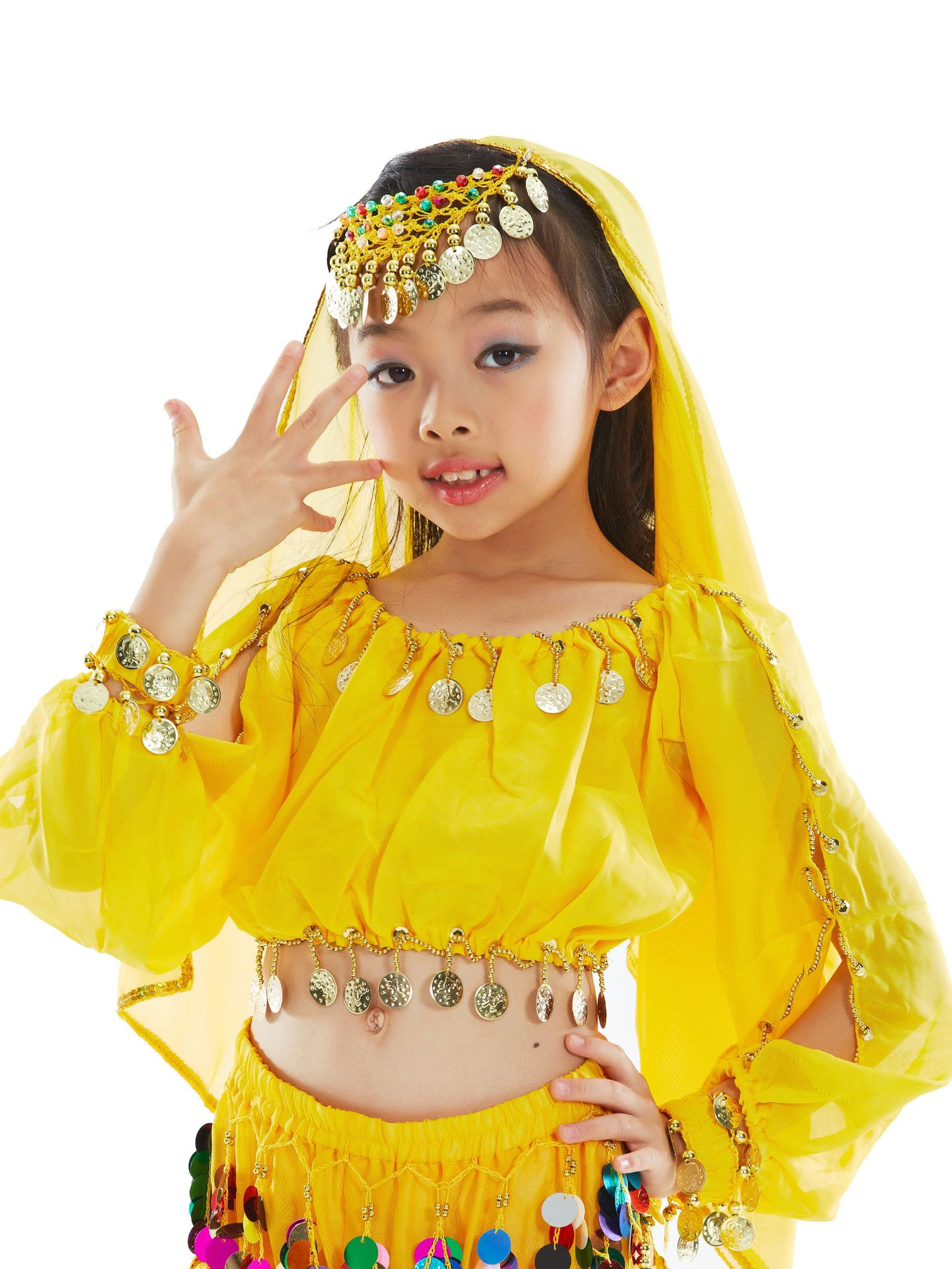 4件套:头链+头纱+灯笼长袖+混色铜锣旋转裤