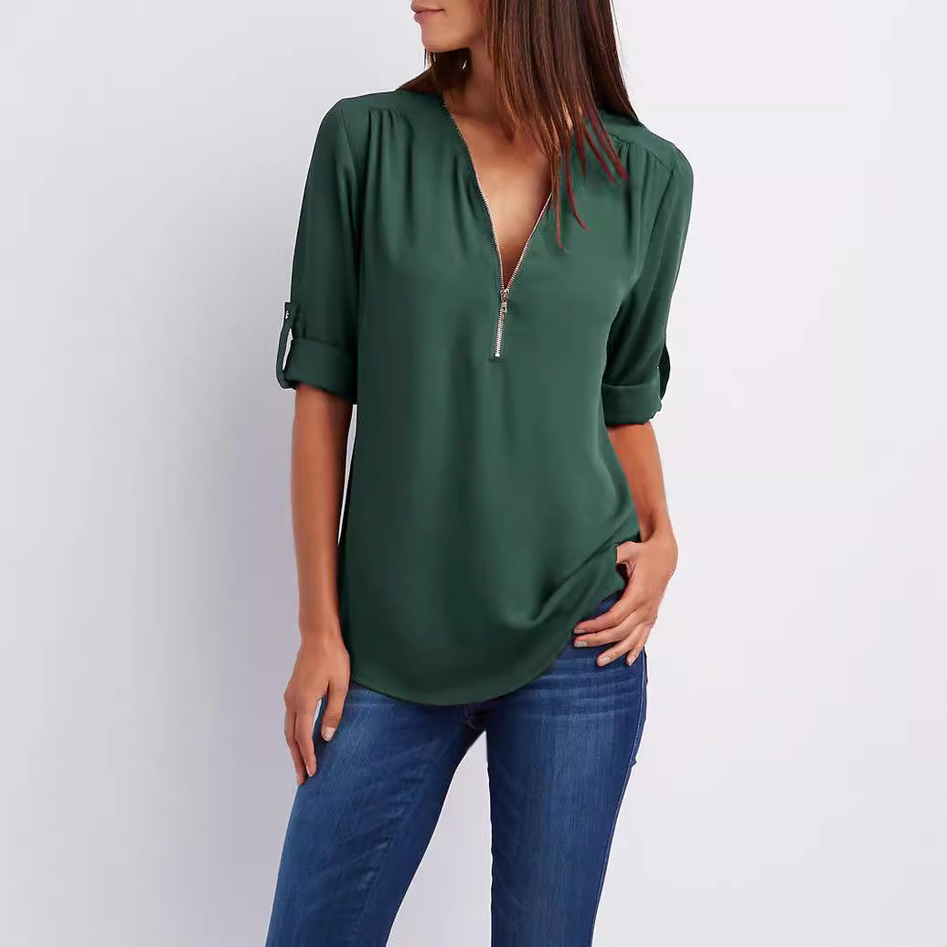 跨境全托管爆款V领拉链大码女装长袖可挽袖宽松雪纺衫衬衫上衣女