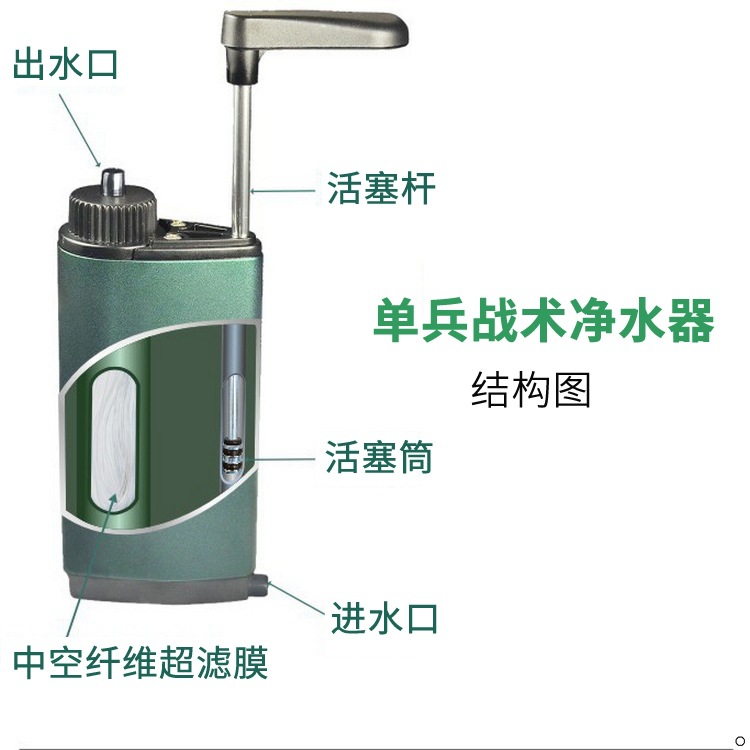 产品名称 单兵战术净水器 品牌 Diercon (可定制logo) 公司类型 生产厂家 地址 广东东莞 型号 TW01 规格 72*38*148mm 颜色 军绿色(可定制) 材质 铝合金,ABS, PP 滤芯 超滤膜,活性炭 流速 600ml/min 净水容量 3000L 过滤水源 户外三类以上淡水水源 产品特点 坚固 耐用 便携 产品功能 高效过滤>99.9999%细菌,有效去除有机微污染物、异味,改善口感 应用 野外应急救援、地质勘探、露营、登山等 证书 TUV SUD检测报告,广微测检测报告,ISO9001证书
