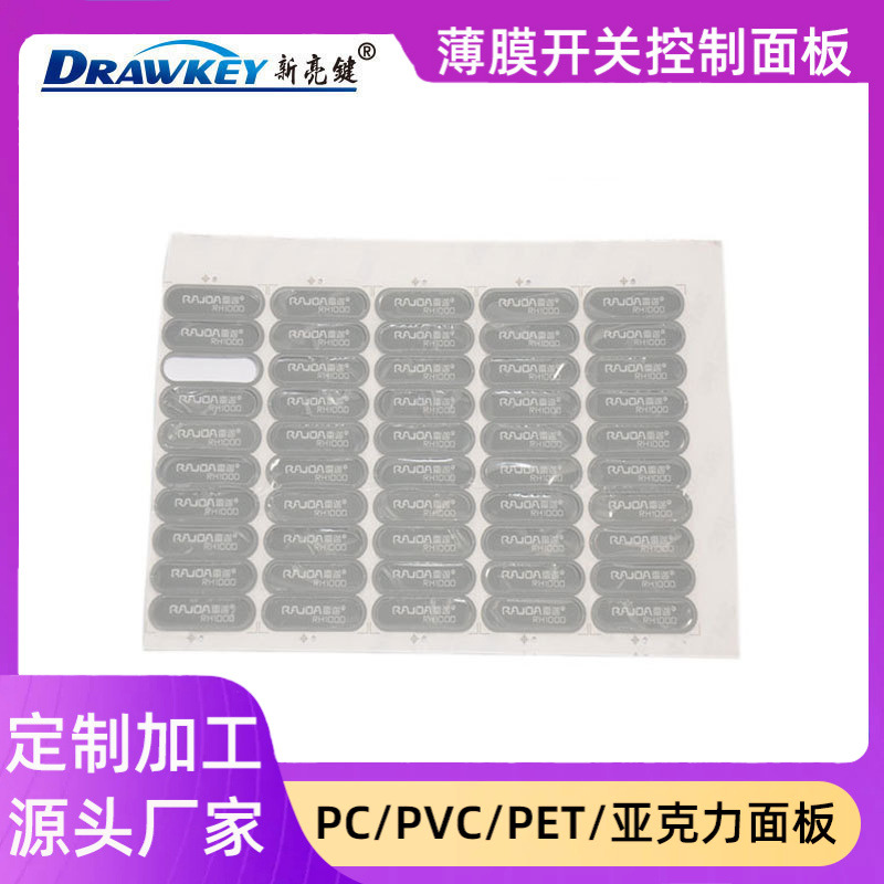 PC薄膜铭板原材料均采用日本十条UV、韩国进口银浆,美国ACHESON埃其森银浆,GE PC 杜邦PET等性能稳定的原材料,并配以先进的卷对卷生产设备及一批拥有15年以上经验的专业技术人才,使PC薄膜铭板的质量、性能、使用寿命更胜一筹!在玩具学习机,键盘行业,薄膜开关面板等行业拥有良好的口啤,赢得广大客户的一致好评。