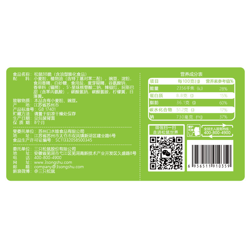 브랜드 다람쥐 세 마리/다람쥐 세 마리 판매 방법 포장 상품 바코드 일치하는 항목이 없습니다 가져오기 여부 아니오 원산지 중국 본토 생산 라이센스 번호 SC11334022505879 제품 카테고리 감자 칩 할랄 음식 예 원재료 및 성분 다른 보관 방법 시원하고 건조한 곳에 보관해주세요 명물 아니오 유통 기한 240 생산 날짜 포장 참조 제조업체 쑤저우 코슈이와 식품 주식회사. 순 내용 (명세) 105 제품 표준 번호 GB 17401 항목 번호. A0478 포장 사양 105 g/bag 맛 오리지널 맛 포장 시리즈 심플 시리즈 핫 셀링 월간 일년 내내 설탕 함유 여부 설탕 함유 저장 조건 상온 생산 공정 다른 -