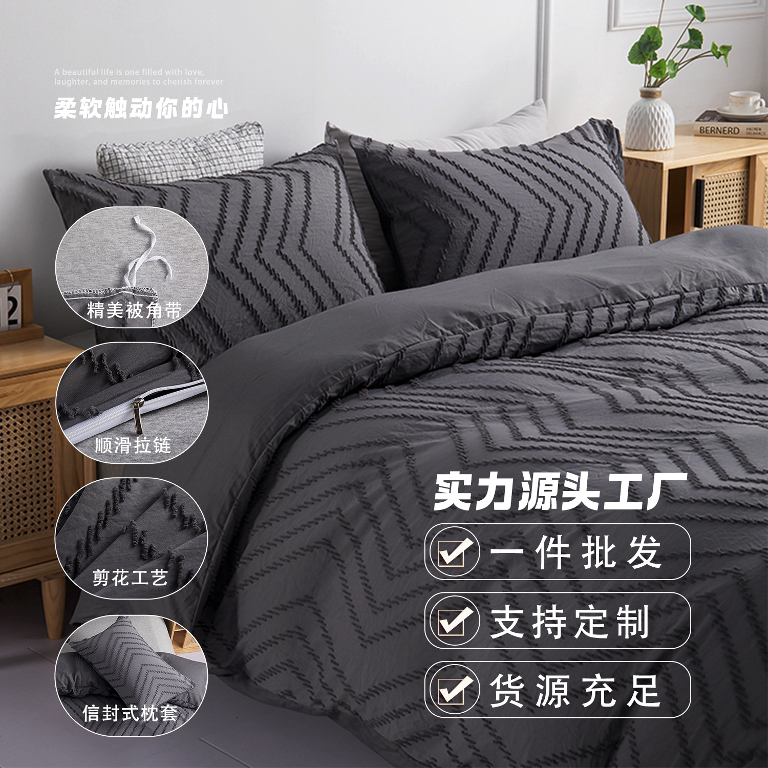 【工艺说明】暗线锁边被套,被套四个角有被角带 枕套为锁边口袋枕