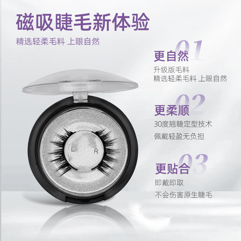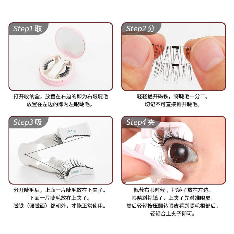四、方便的磁性盒:两对磁性睫毛安全地放在便携式磁性盒中,可以随身携带放入钱包或者手提包中。五、如何正确佩戴睫毛:确保睫毛方向正确的情况下,磁铁背面吸附在睫毛夹上。然后对准上眼皮往上压,让睫毛贴合到根部再合上睫毛夹。慢慢放开夹子底部,再轻轻拿开夹子顶部。