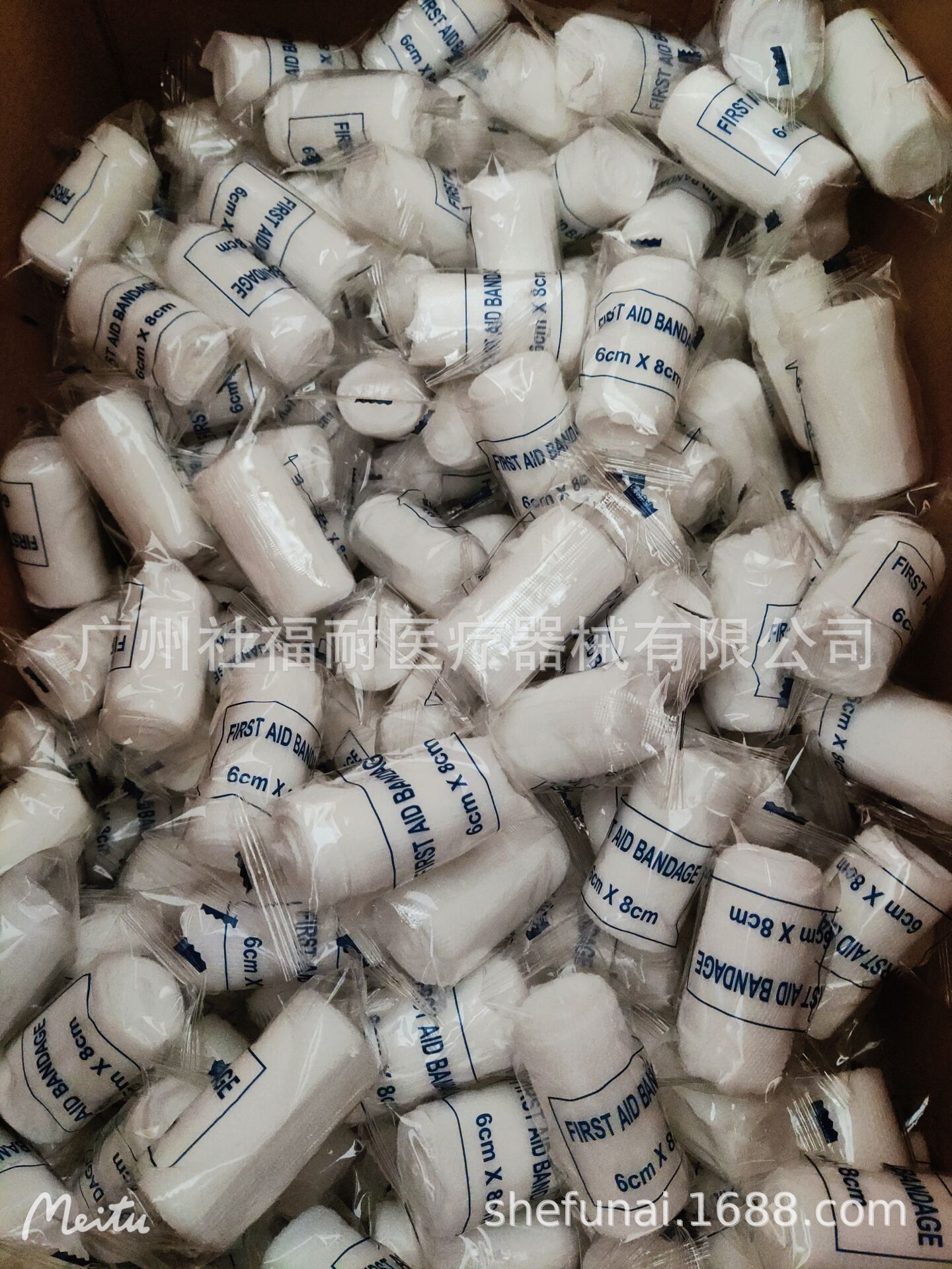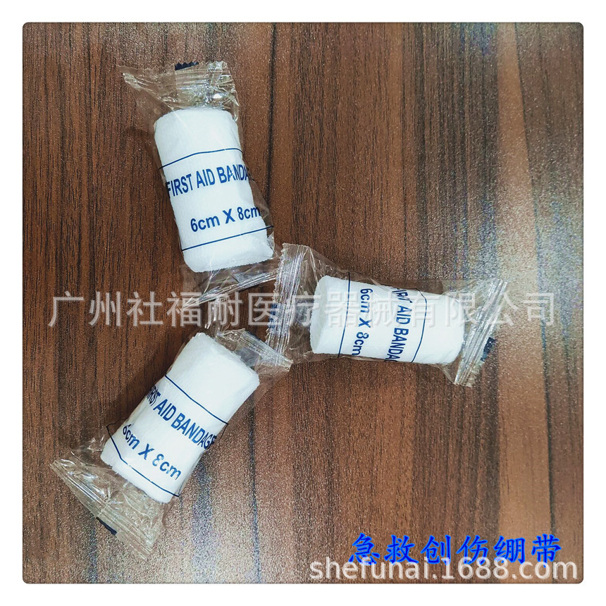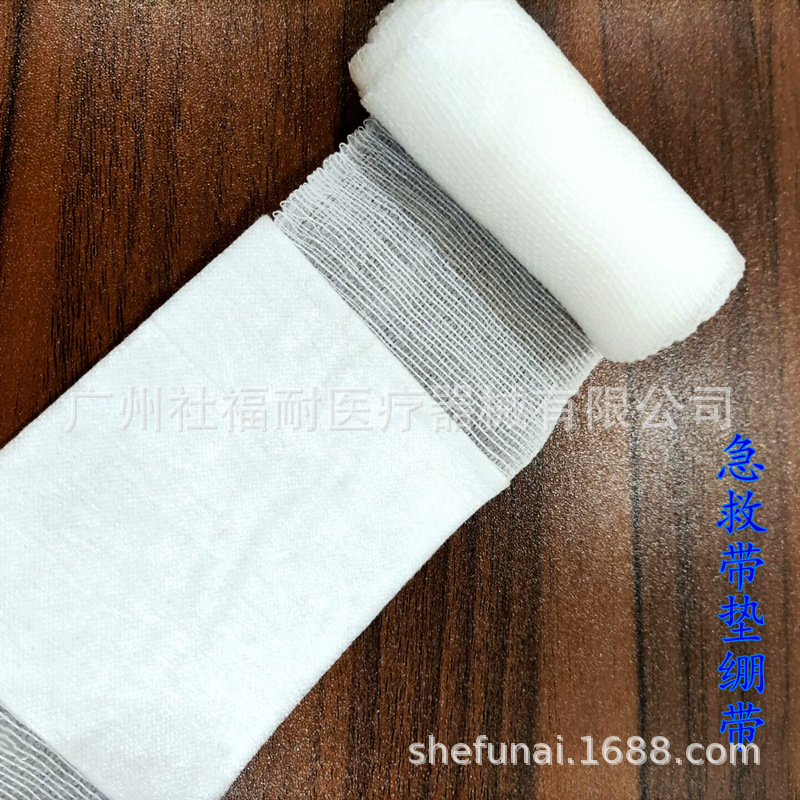 产品名称:带垫绷带 尺寸:中间垫8*10CM 绷带长4M, 单个独立包装 OPP袋装,材质:涤纶+棉。单重:10克。