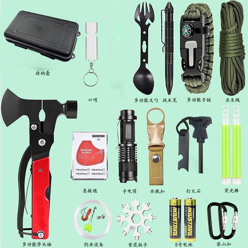 战术笔*1; 多功能斧头*1; 雪花工具*1; 手绳*1; 手电筒(电池*2)*1; 多功能勺子*1; 水平挂扣*1; 口哨*1‘ 荧光棒*2; 鱼包*1; 伞绳*1; 登山扣*2; 打火石*1; 救生毯*1