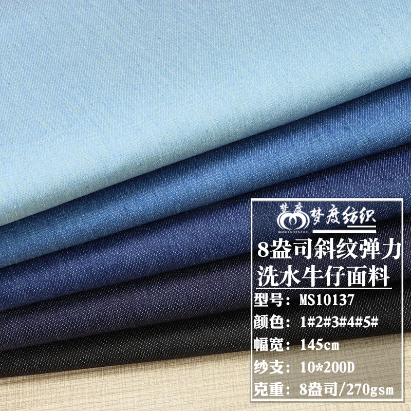 标题 网单热销10*200D弹力洗水牛仔布 8盎司斜纹外单热销牛仔围裙面料现货 货号 MS10137 品名 10支弹力洗水牛仔布 厚度 8oz 克重 270gsm 门幅 143-145cm 纱支 10*200D/20+40 组织 斜纹 成分 65%C 33%P 2%SP 颜色 1#浅白、2#浅蓝、3#蓝色、4#特深蓝、5#黑色 弹力指数 弹力
