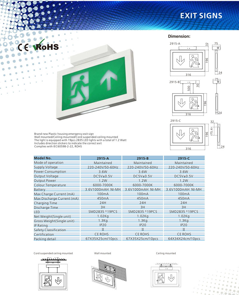LED 표시기 램프 안전 출구 조명 화재 비상 조명 EU 핫 스타일 자체 테스트 기능 CE,ROHS