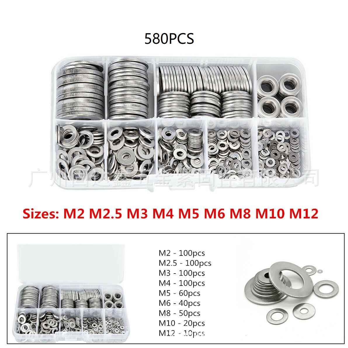 跨境专供580PCS盒装不锈钢平垫圈 M2/2.5/4/5/6/8/10/12 垫 爆款