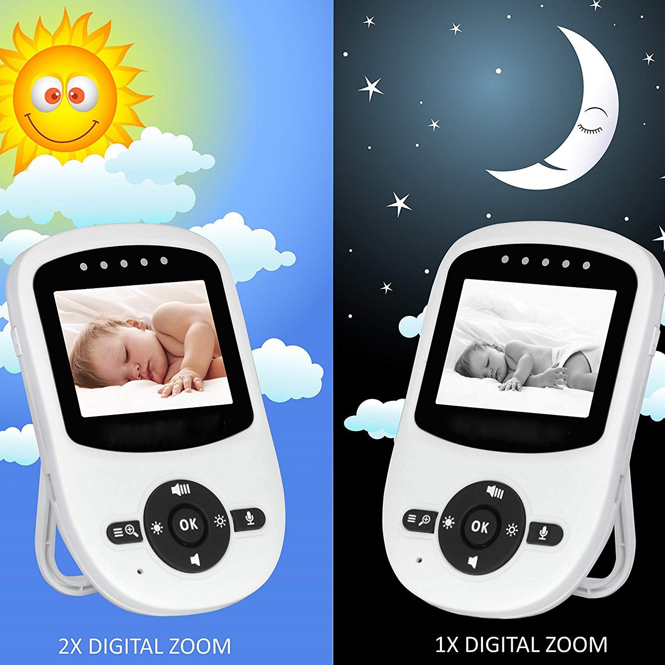 ♥ 双向对讲(父母端→宝宝端:按住对讲键对讲;宝宝端→父母端:直接传输)