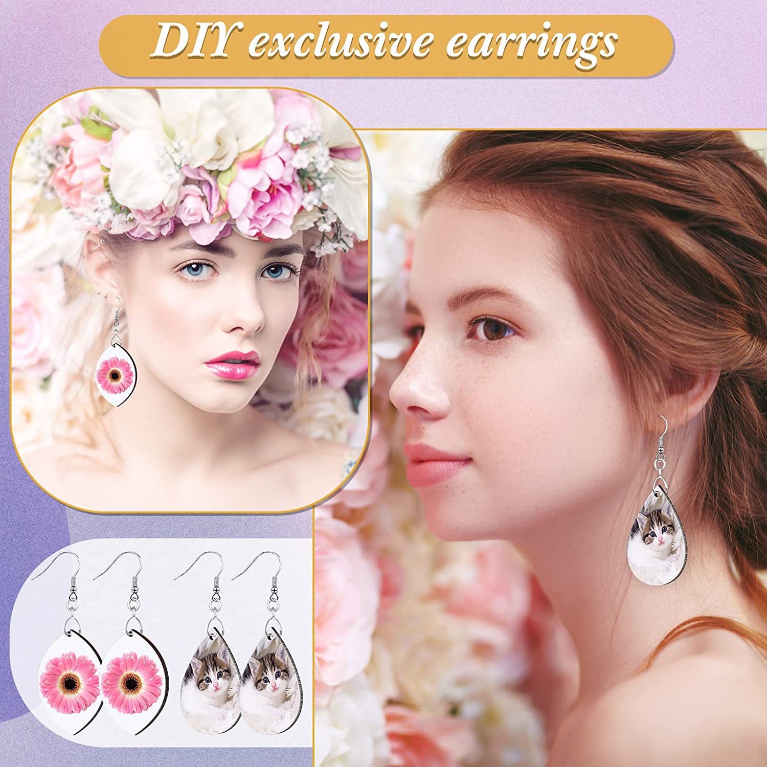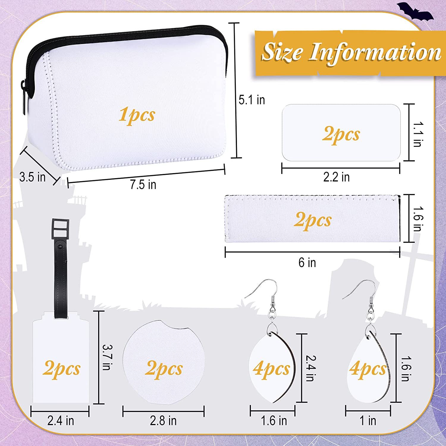 产品配件:1个化妆包,2个冰箱磁贴,2个冰袋套,2个空白行李牌,2个杯垫,4对密度板耳环,6个密度板钥匙扣,2个洗手瓶套,2个口红套,2个手腕带