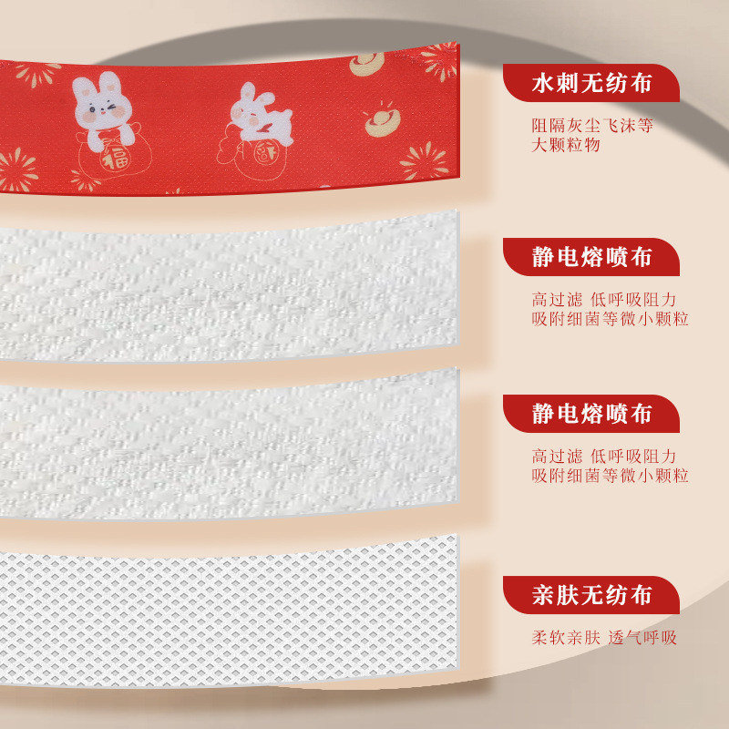 | 재료 | 부직포 + 멜트블로운 천 + 멜트블로운 천 + 부직포 + 피부친화 부직포 |