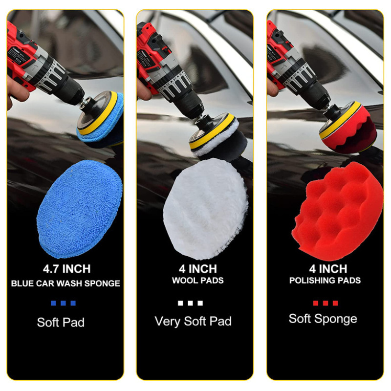 20片4寸百洁布,2片4寸波浪海绵,2片龟纹海绵,2片平面海绵,3片4.7寸手工打蜡海绵,3片仿羊毛垫,