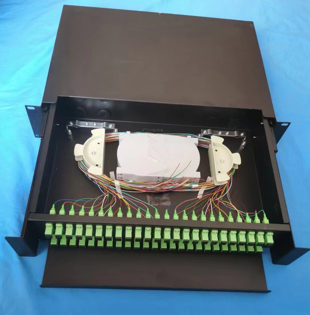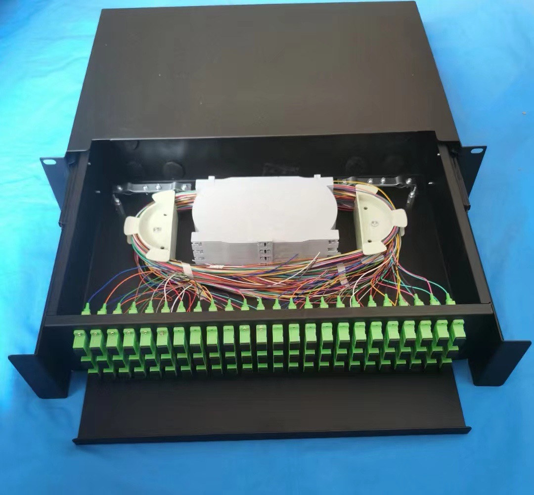 备注;以上此款产品为裸板1.2mm厚度金属导轨抽拉式代导轨光纤终端盒盒,2U有48口,72口;单工小孔或者双工大孔;小孔48/48熔72芯或者LC96/144芯;大孔SC双工48口就72芯;72口就144芯, LC四联48口就LC192芯;72口四联就LC288芯;根据客户要求大芯数,大熔量为节约成本;
