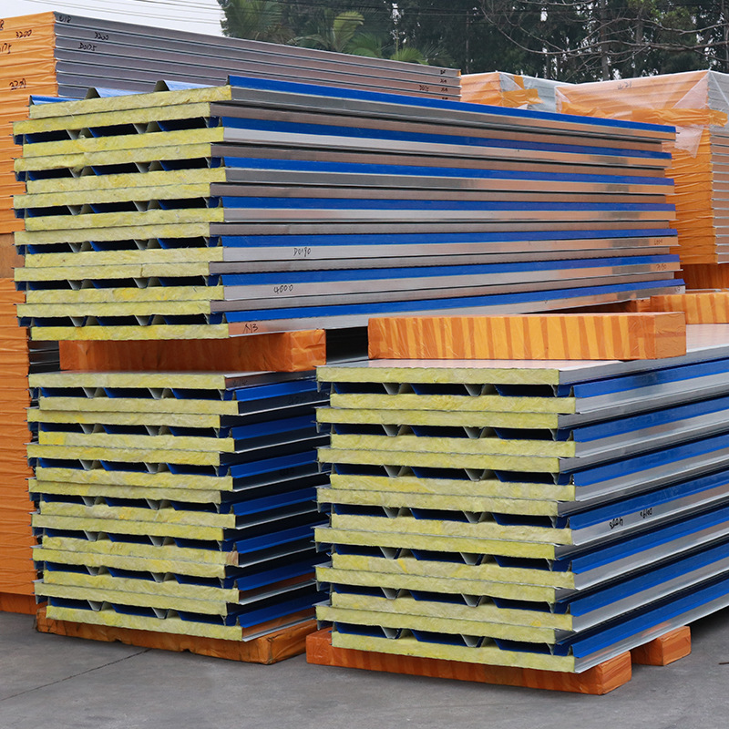 공장 핫 컬러 스틸 유리 울 샌드위치 패널 50mm 두꺼운 골판지 지붕 단열 외벽 방음 용 내화 타일