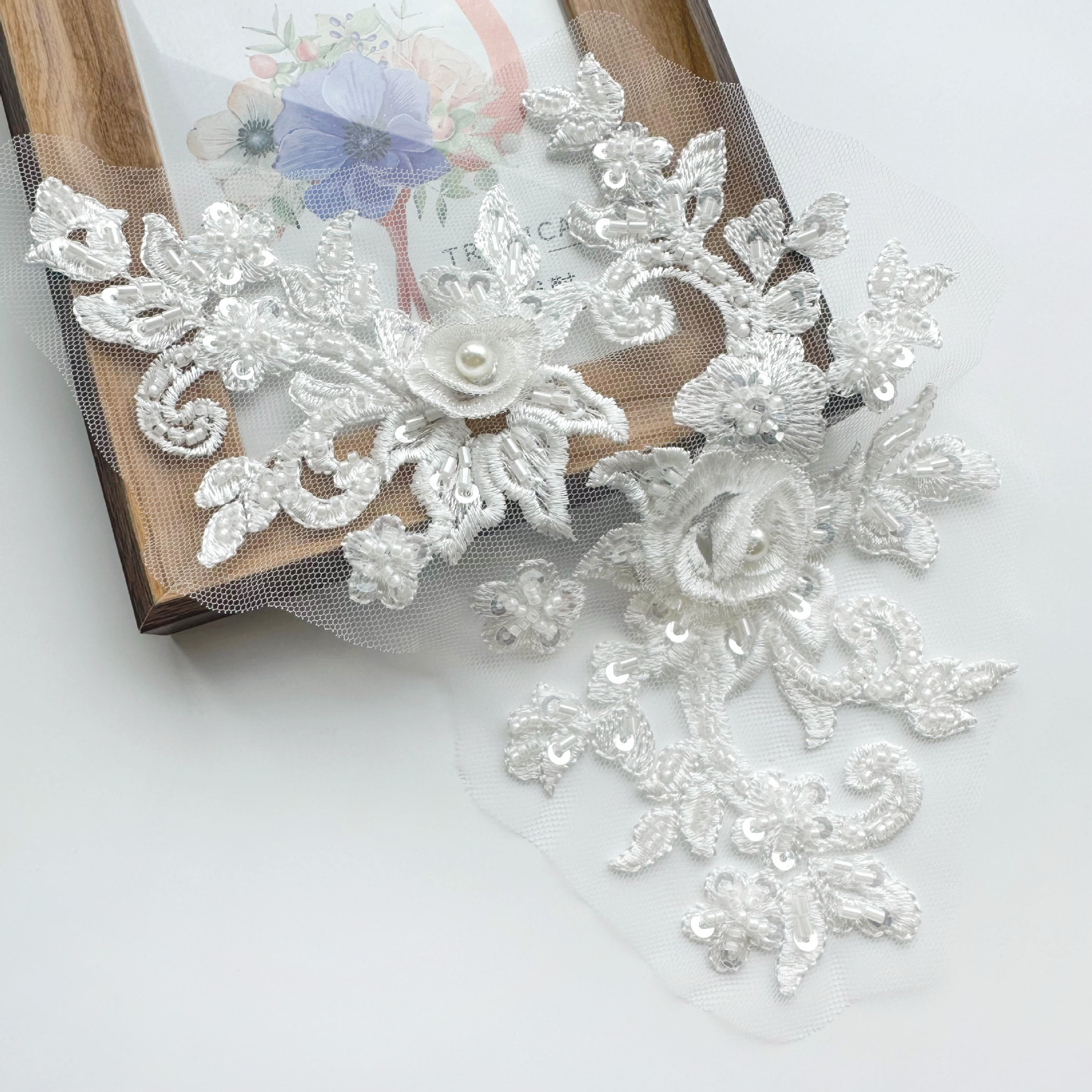 화이트 비즈 장식 스팽글 입체 꽃 장식품 인기 신상 웨딩 의류 액세서리 수제 소재 전자상거래