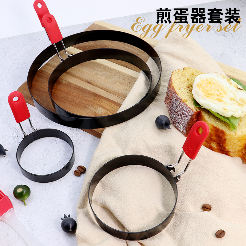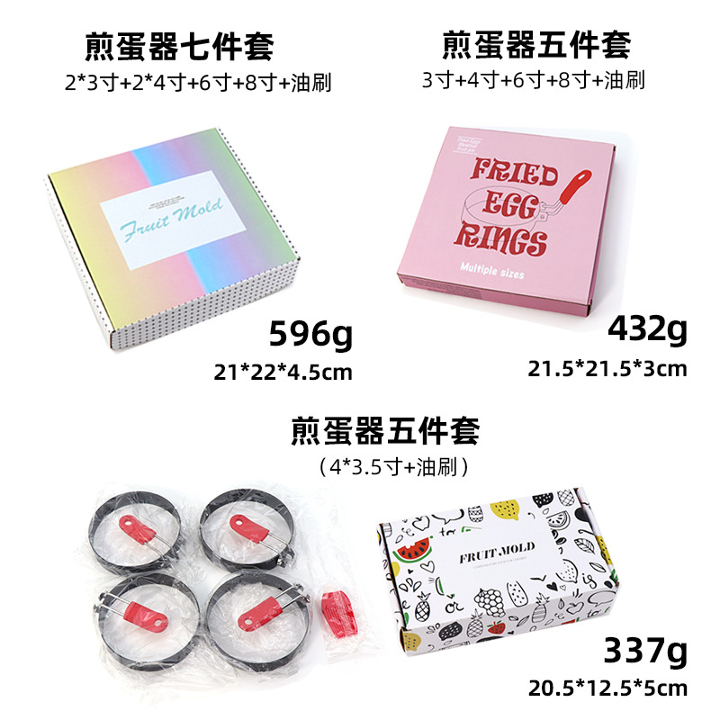 温馨提醒:此链接是套装组合的,客户也可以根据自己的喜欢自由搭配联系客服的跨境供应亚马逊烘焙工具 不粘圆形煎蛋模具不锈钢煎蛋器硅胶煎蛋圈蛋糕模具规格:3寸/3.5寸/4寸/6寸/8寸净重:3寸约55g/3.5寸约67g/4寸约72g/6寸约105g/8寸约127g厚度:1.2mm手柄:有浸塑柄,有硅胶手柄颜色:黑色,橙色,红色,蓝色,黄色包装:套装组合彩盒装可贴牌,需要的请联系我们客服