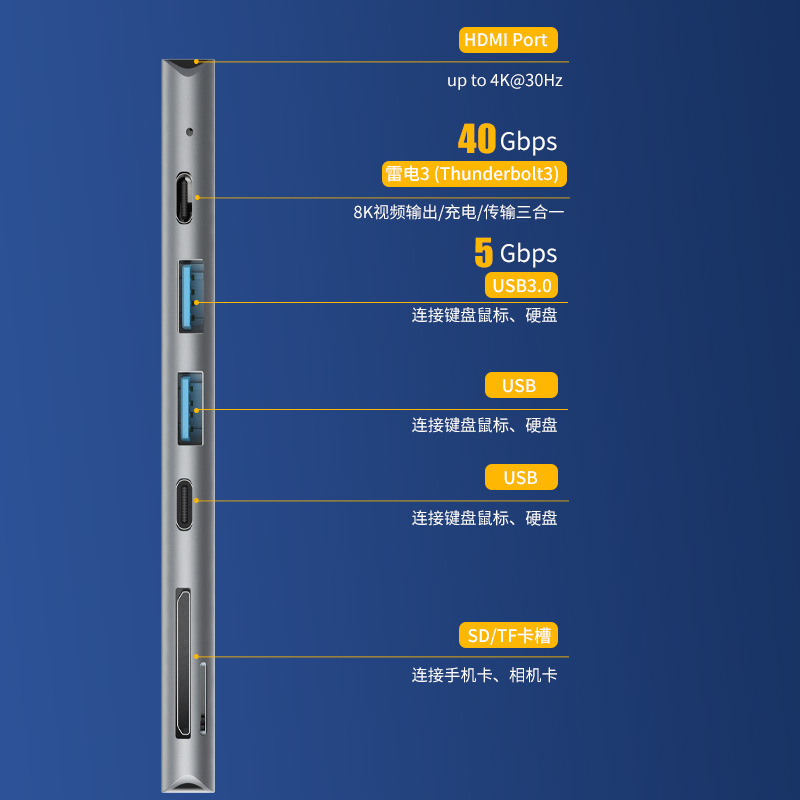 2、完美实现HDMI+USB*2+PD*2+TF+SD 视频 数据 供电 读卡等多功能应用;