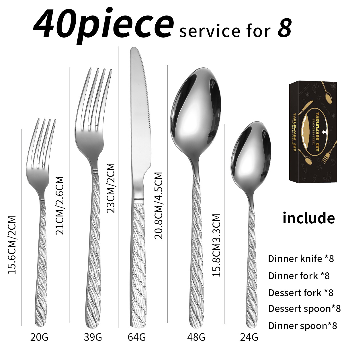 수입 여부 아니 제품 카테고리 칼, 포크, 숟가락 항목 번호. 결핵 소재 스테인레스 스틸 연마 과정 천 바퀴 빛 (거울 연마) 적용 가능한 객체 성인 스타일 북유럽 스타일 사양 칼, 포크 및 숟가락의 20/24/40 세트 선물을주는 행사에 적합 기타 인쇄 된 로고 OK 스테인레스 스틸 소재 410 스테인레스 스틸 맞춤형 처리 예 시장에 시간 2024 가격 세그먼트 30-40 위안 특허가 있습니까? 아니 색상 블랙 40 피스 세트/8 명 주요 하류 플랫폼 기타 주요 판매 지역 기타 개인 브랜드를 승인 아니 제품 품질 등급 일류 제품 국경 간 수출이 독점적으로 가능한지 여부 예 수동 여부 예 스타일 유형 심플한 스타일 -