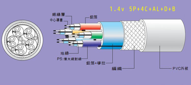 线规:5(1P*36AWG+AE)+4C*36AWG+AEB OD:3.2MM 高弹性PU外被