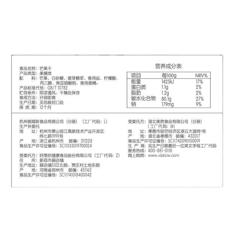 유통 기한 365 일 제품 표준 번호 GB/T10782 수입 여부 아니 브랜드 초본 맛 원산지 절강 상품 바코드 6948939623201 생산 면허 번호 SC11333019700024 포장 사양 말린 망고 100g 뜨거운 판매 달 일년 내내 저장 조건 실내 온도 -