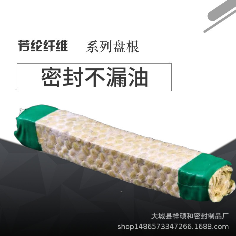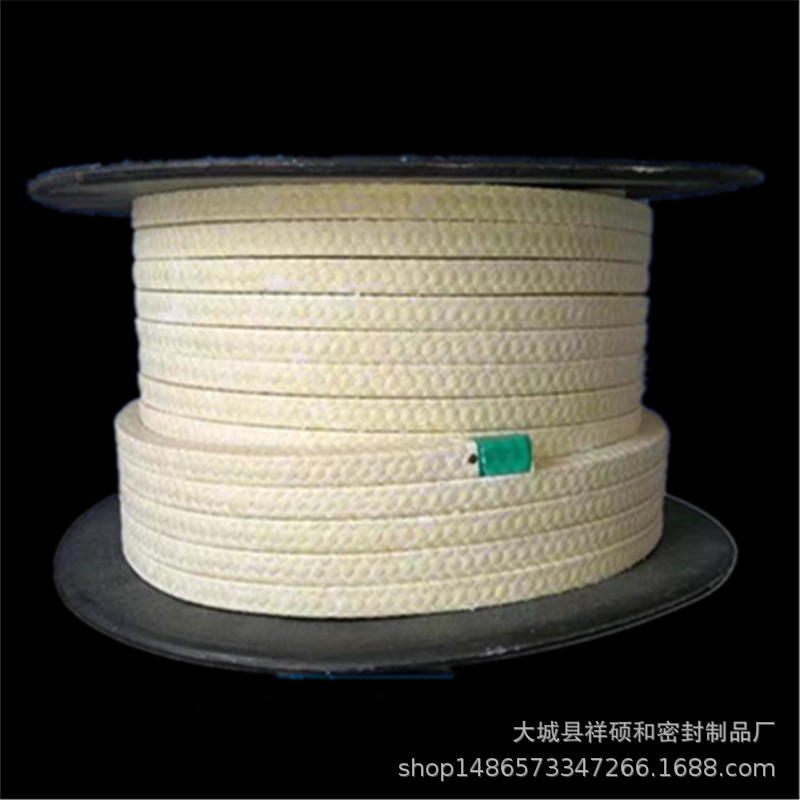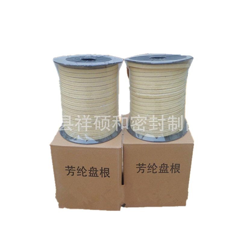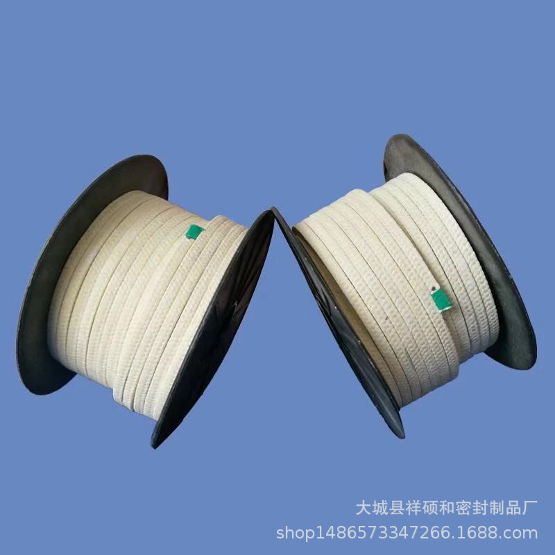 芳纶盘根由芳纶纤维浸渍聚四氟乳液和润滑剂处理编织而成。有较好的耐化学性,高回弹,低冷流。具有极好的高转速、高模数的性质(被称为人造金属线)它的强度是金属丝的三倍,重量比金属丝轻五倍。所以,与其它类型的盘根比较,它能抵抗颗粒结晶介质和更高的温度既可单独使用也可与其它盘根组合。在泵系统上是很好的石棉替代产品。主要用于化学、石油、制药、食品和食糖,纸浆、造纸及电力行业。适合于含固体颗粒的易磨损介质,推荐使用于过热蒸汽、溶剂、液化汽、糖浆及其它易磨流体。泵轴或防护套的表面硬度要达到60HRC.