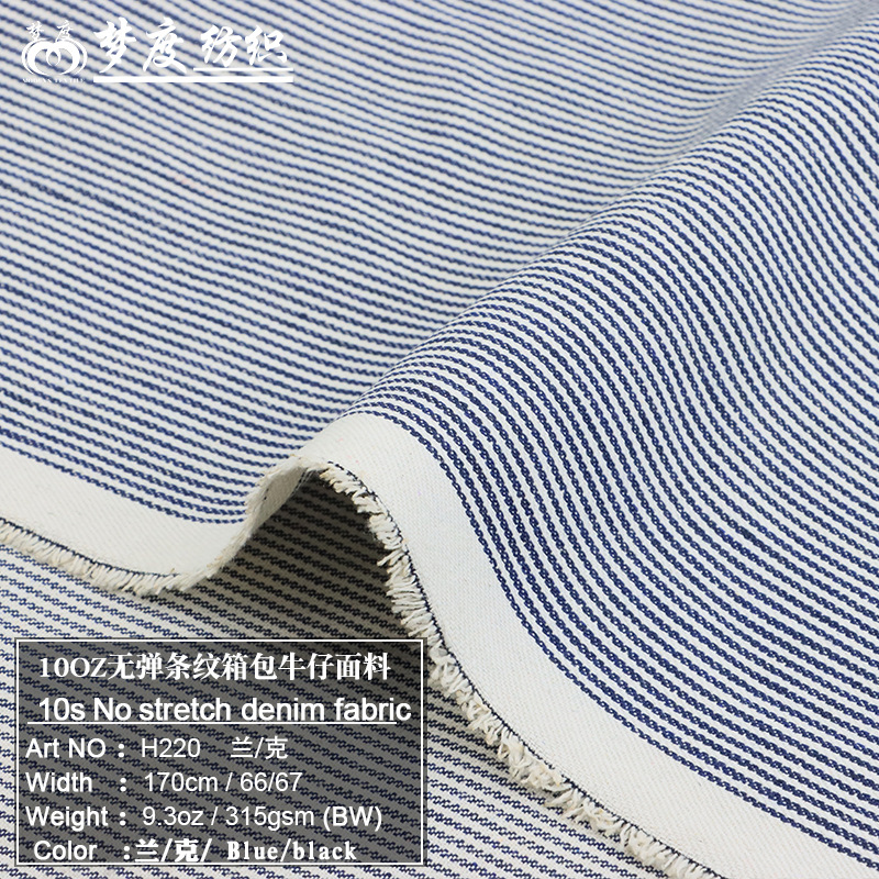 标题 网单热销全棉10安条纹无弹牛仔布1mm*1mm牛仔箱包围裙面料现货 货号 H220-1/H220-2 品名 10支条纹无弹牛仔布 厚度 9.3oz 克重 315gsm 门幅 165-170cm 纱支 10*10 组织 斜纹 成分 65%C 35%P 颜色 蓝白条/黑白条 弹力指数 无弹