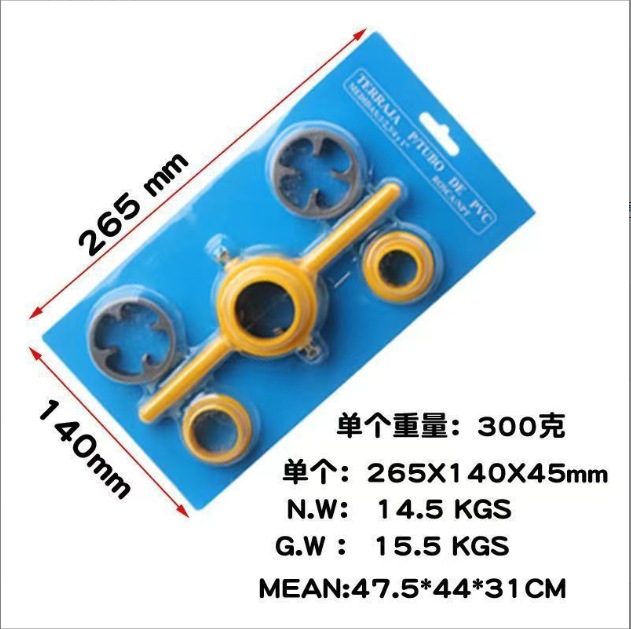 6PC塑料水管板牙,货号102,装箱数50pcs,外箱尺寸:54.5*24.5*50cm ,毛重15.6kg,单个尺寸14.5*13.5*3.5cm,单个重量299克