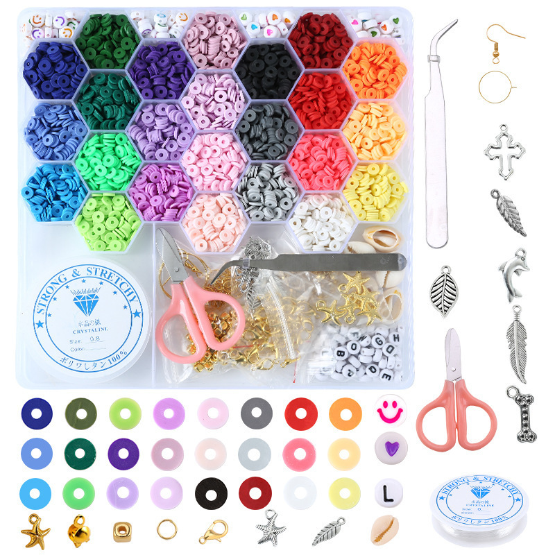 新款2(约5205pcs)软陶片每格200片 彩色笑脸珠爱心珠 每格20颗 字母珠52颗 耳钩 10个 银色的金属配件10个 贝壳10个 海星10个 四方珠100 闭口圈50个 包扣 50个 龙虾扣20个 耳圈10个 纱剪一个 镊子一个 弹力绳一个