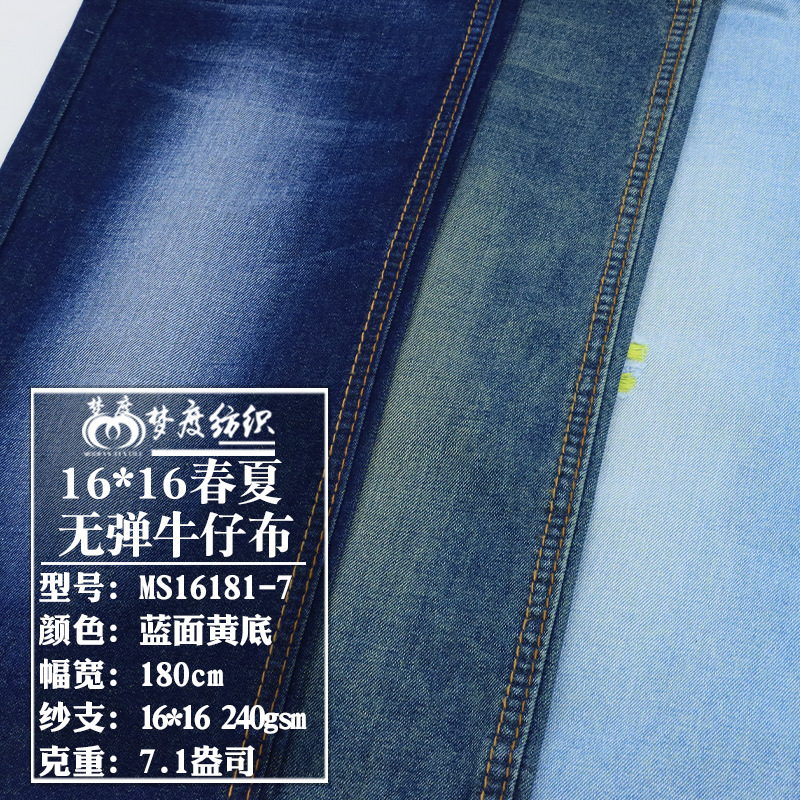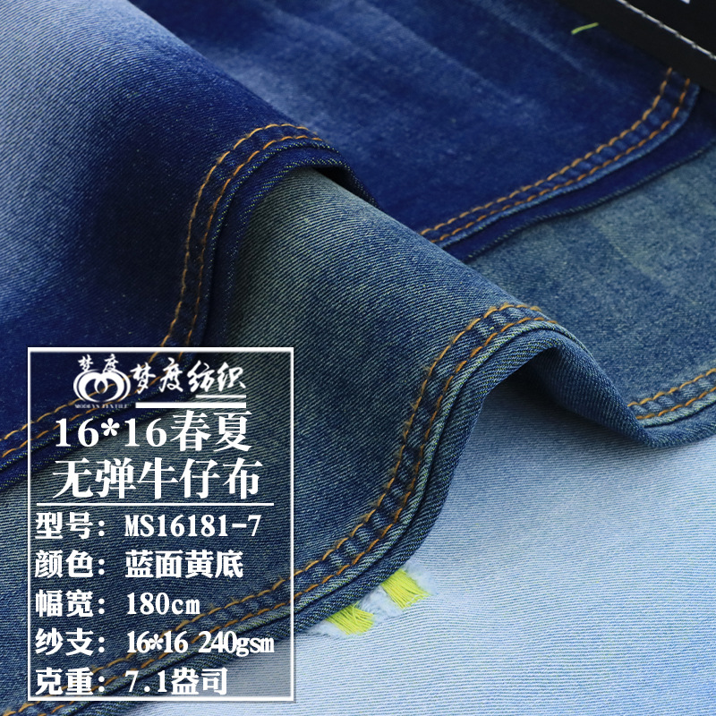 标题 春夏热销16支全棉蓝面黄底无弹牛仔布男女牛仔衬衫服装面料现货 货号 MS16181-7 品名 16支全棉无弹牛仔布 厚度 7.1oz 克重 240gsm 门幅 180cm 纱支 16*16 组织 斜纹 成分 90%C5%R5%P 颜色 蓝面黄底 弹力指数 无弹