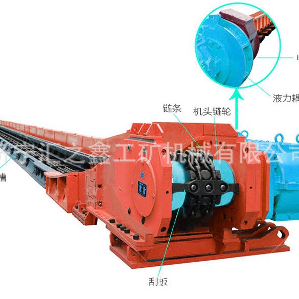 矿用刮板输送机是由机头、中间部分、机尾、刮板链和附属装置(挡煤板、铲煤板等)组成的矿用输送机