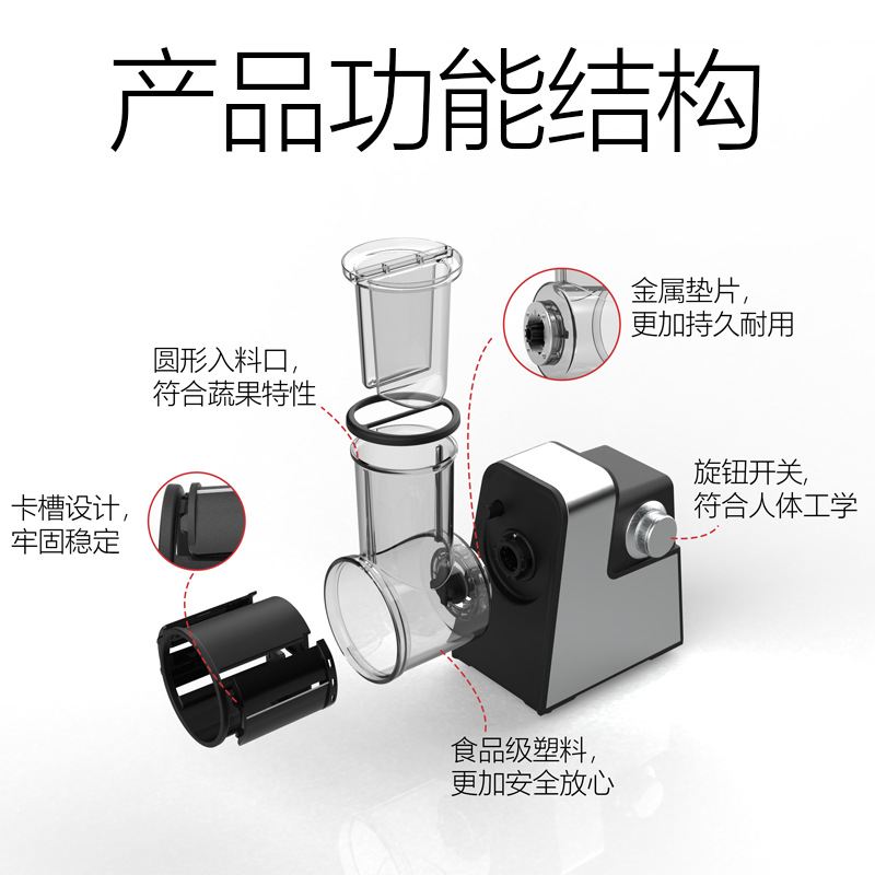 这是一款家用为主的多功能切菜机,能够快速实现切菜,不伤手,整机所有材质均通过 CE 认证,性能优越,放心采购!