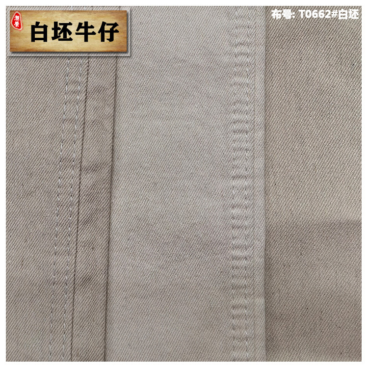 标题 南非外贸订单热卖款 洗前10.6盎司右斜纹8支经纱弹力牛仔布 T0662 货号 T0662 品名 弹力牛仔布 厚度 10.9 oz 克重 369 gsm 门幅 178-180 cm 纱支 8*16/70 组织 3/1 Z斜纹 成分 65.5%棉 33%涤 1.5%氨纶 颜色 深蓝、黑底黑面、白坯 弹力指数 弹力