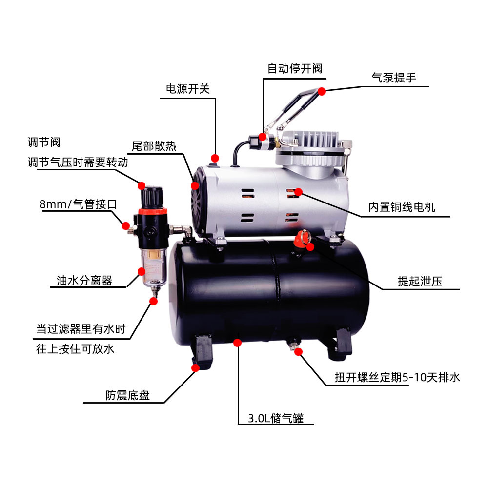 원산지 심천 수입 여부 아니요 브랜드 마스터 처리 및 맞춤화 아니요 품목 번호 TG212-T 최대 출력 압력 4BAR 최대 제트 흐름 23L/MIN 최적의 제트 거리 100-200 스프레이 폭 100-200 전체 기계 무게 6 전체 치수 310*150*330 적용 범위 모델 문신 페인팅 스프레이 케이크 네일 아트 스프레이 컬러링 재료 구리, 플라스틱 크기 31*15*33cm 품목 번호 주문 TG212-T-유럽 플러그-220-240v 제품번호 TG212-T-유럽 플러그-220-240v 시리즈 모델 공기 펌프 소형 공기 압축기· -