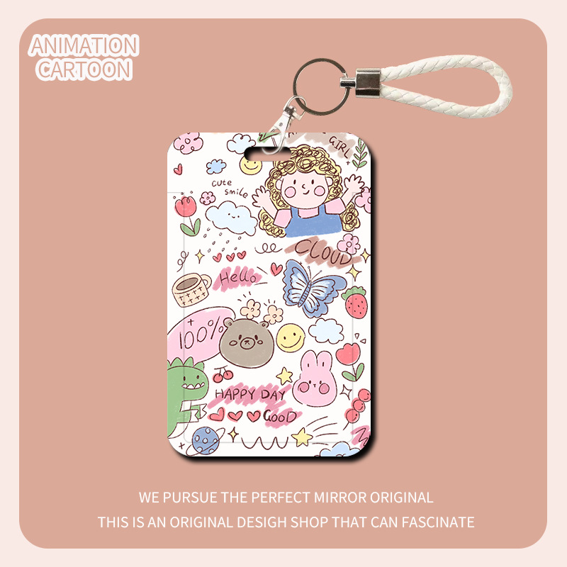 귀여운 낙서 소녀 카드 홀더 + 흰색 가죽 밧줄