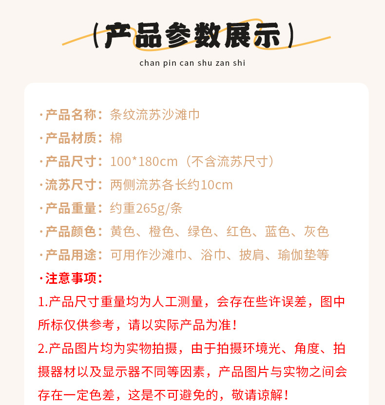 상표 다른 품목 번호 0 재료 순면 무게 300g(포함)-400g(제외) 맞춤형 처리 예 색상 검은색 사양(길이*너비 cm) 100*180 원사 사양 21개 속성 1 터키 태슬 비치 타월 생산 과정 평직 속성 2 국경을 넘나드는 인기 목욕타월 카테고리 목욕타월/비치타월 속성 3 여행 제품 -