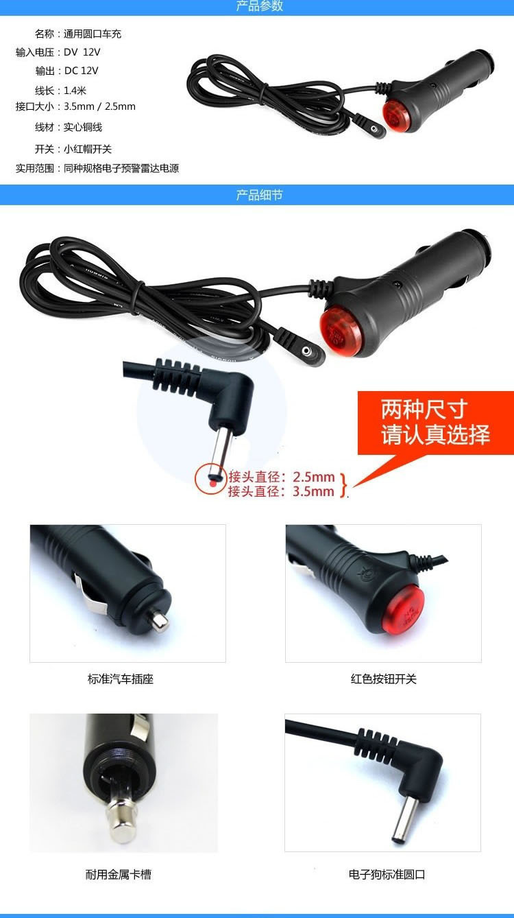 12V车载电源供电转12V,带红色开关,3.5米加长线,3.5DC阴叉弯头输出接口,适合所有的车型,各种善领/南极星/征服者/纵天等GPS机器,也可给车载电子狗,12V的记录仪用充电用。
