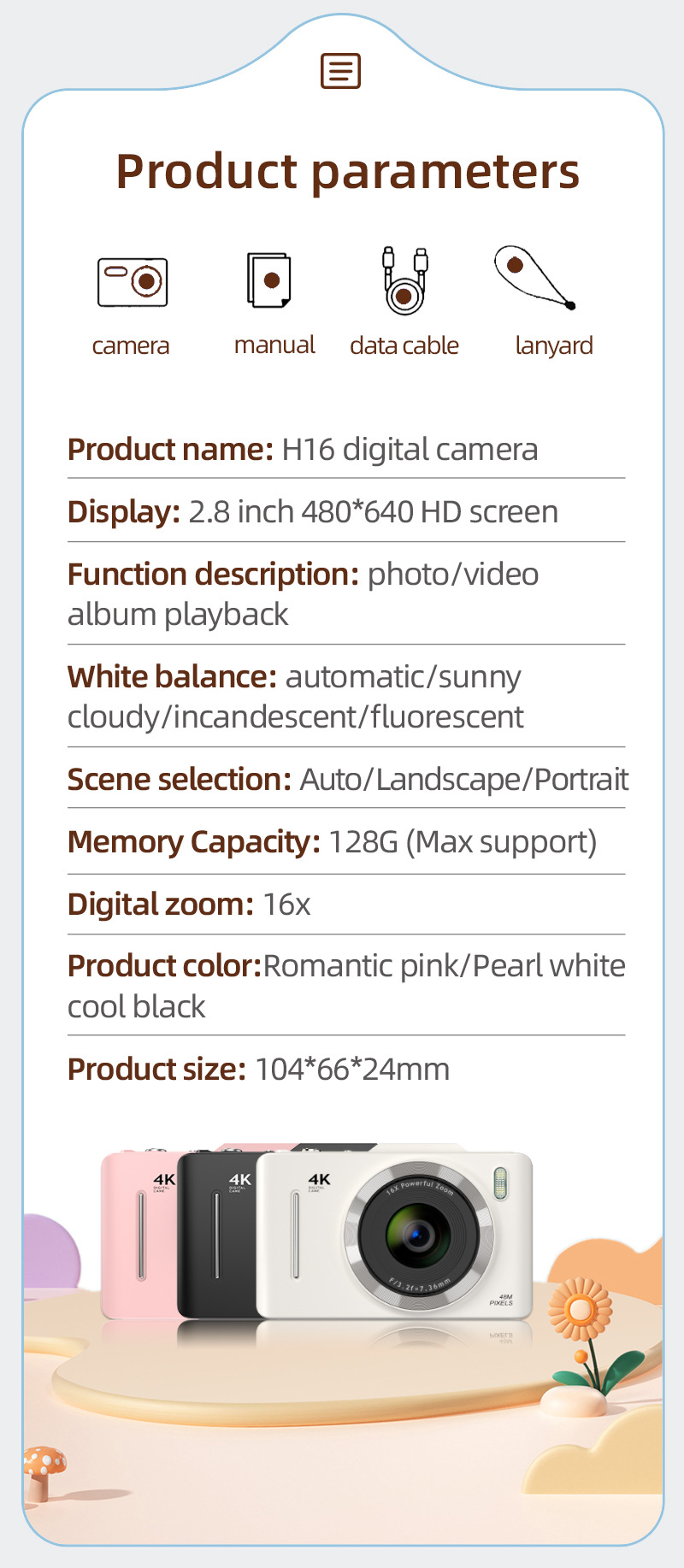 브랜드 다른 시리즈 CCD 학생 카메라 품목 번호 다른 모델 H16 원산지 중국 공급 카테고리 스팟 제품 유형 아주 새로운 디지털 카메라 유형 스마트 카메라 적용 가능한 시나리오 성격 트렌드 작동 모드 완전 수동 조작 센서 유형 CCD 센서 크기 2.8inch 유효 픽셀 24.0million 이상 광학 줌 배율 16회 디지털 줌 배율 16회 최대 해상도 4800*9600 LCD 화면 크기 2.8inch 화면 유형 HD 화면 운영 체제 버튼 저장 매체 TF 카드 동체 메모리 없음 렌즈 유형 잠재적인 흔들림 방지 성능 광학 손떨림 방지 특수 기능 초점을 맞추다 데이터 인터페이스 USB2.0 재료 ABS 전체 치수 104*66*24mm 배터리 유형 리튬 배터리 제품 무게 250g 선물 제공 행사에 적합 홍보 기획 처리 방법 맞춤형 샘플 가장 빠른 배송 시간 1~3일 낙하 배송을 지원합니까? 지원하다 포장 목록 카메라, 충전케이블, 설명서, 랜야드 시장 출시 시간 2024 애프터 서비스 매장 3개 보증 송장 송장은 제공되지 않습니다 바디 컬러 검은색 주요 다운스트림 플랫폼 다른 주요 판매지역 다른 국경 간 수출 전용 공급 여부 예 -