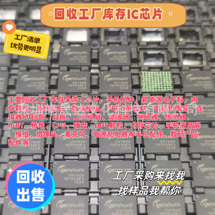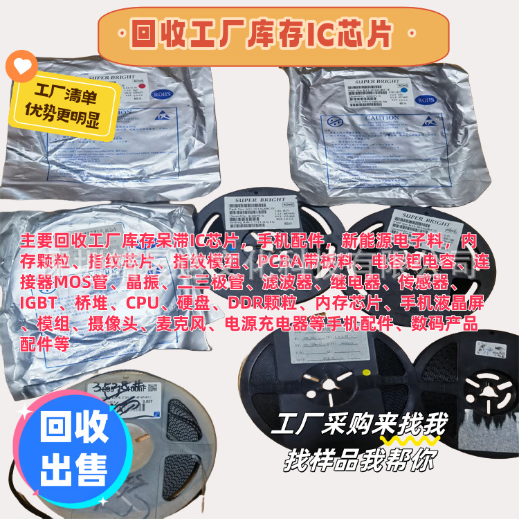 公司所有产品均为原装正品,另公司也有大量回收工厂库存呆滞的电子物料,有清单可以甩过来,报价速度快,合作方式多样。我们以努力处事、以诚信待人,广渠道为客户消化库存呆滞电子心芯片,电容晶振,连接器,手机配件等工厂所有电子物料。我们变易灵活方便,价格还高