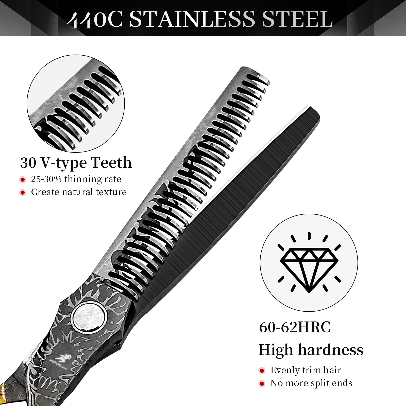 基本参数 品牌(Brand) 系列专业理发剪刀 美发剪刀(可定制LOGO) 型号(Model) JS 尺寸(Size) 6.0英寸(Inch) 级别(Level) 全长(Total length) 17.5厘米(CM) 材料(Material) 440C 硬度(Hardness) 62HRC 打薄量(Thinning rate) 20%-35%