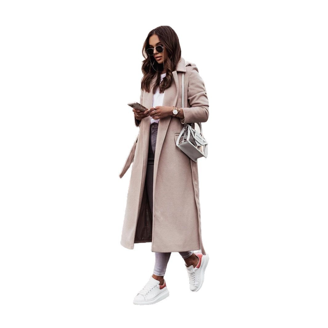 独立站wish亚马逊爆款 秋冬简约长袖V领绑带毛呢外套女装