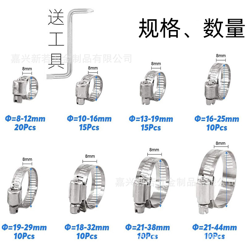 사양 100개에는 이중 목적 드라이버가 함께 제공됩니다. 유형 웜 호스 클램프 공칭 직경 8-44 조임 직경 8-44 적용 범위 수도관 및 송유관 상표 신루오 하드웨어 -