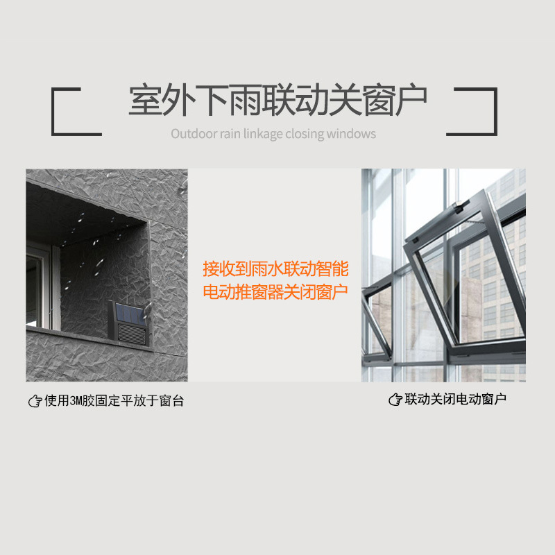 3. 工作原理一、每 60 秒一个周期采集室外雨水变化二、通过物联网模块(如:WIFI、ZIGBEE、Mesh 等)上报给物联网平台(如:涂鸦智能平台等)4.应用场景场景一(室外下雨自动关窗):设备安装于室内当下雨时,通过设定的自动化,联动电动窗子电机或窗帘电机实现自动关窗子或关窗帘,反之。场景二(出门下雨提醒带雨伞):从室内打开智能门锁时,通过设定自动化,联动设备探测是否下雨,若室外下雨则手机提醒“亲爱的主人,出门请带雨伞'”,反之。5.产品安装一、直接用螺丝垂直固定在室外墙面上可以接收到雨水的地方使用二、使用附赠送 3M 胶垂直粘贴于玻璃外侧或墙面等可以接收到雨水地方使用三、直接平放于室外露台上可以接收到雨水的地方使用四、直接倒置于室内地面上使用:当室内漏水到地面时报警,电池可以使用一年后以上,一年后当 APP 提示离线电池没电时,将设备拿到室外放置于太阳光可以照射的地方充 1 天或 2 天电充满电时,放回原地又可以使用半年