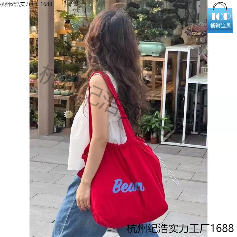 한국 스타일 캔버스 백 2024ins 새로운 일본 스타일 싱글 어깨 대용량 토트 백 드래그 스트링 통근