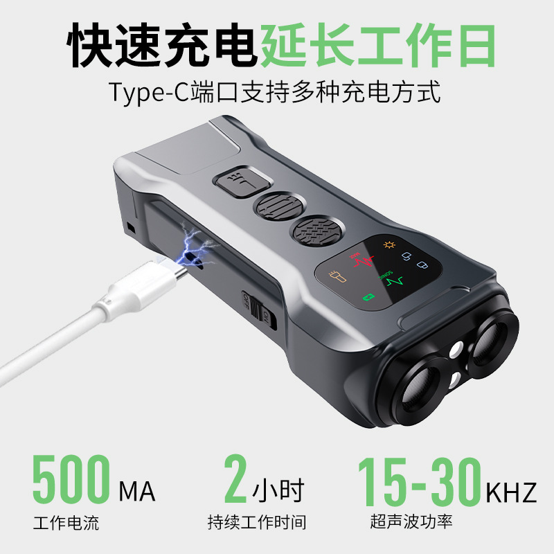 本产品采用超声波声音驱赶,对宠物无实体伤害。用于日常宠物乱叫,或者撕咬的训狗器。外观大方,操作简易和携带方便。能对狗、猫产生强烈的刺激(人耳会有听不到)对于动物会产生不舒服及难以忍受的干扰,而且此一刺耳的声音会在动物接近时更加严重让狗感觉不适宜而做出非常惊恐并仓惶逃离。