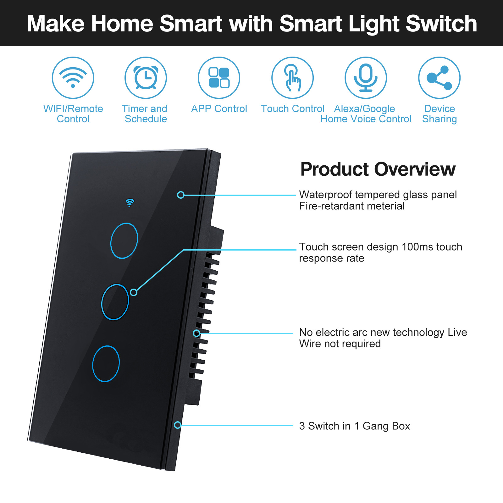 뜨거운 판매 미국 표준 120 유형 WIFI 스마트 터치 벽 단일 불꽃/제로 불꽃 스위치 음성 제어 Tuya tuya