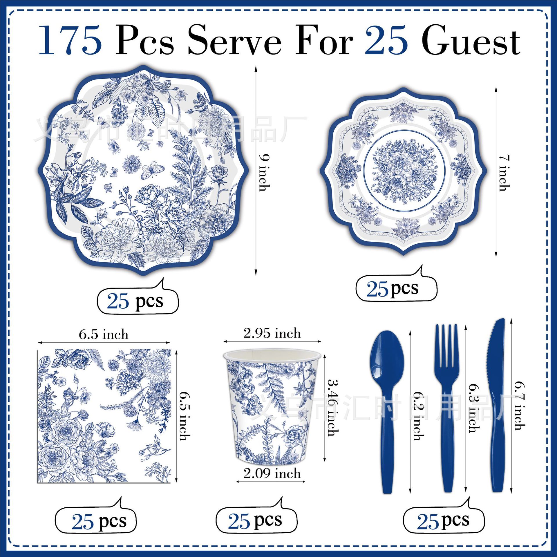 7寸纸盘25个+9寸纸盘25个+纸杯25个+纸巾25张+餐刀25个+餐叉25个+餐勺25个